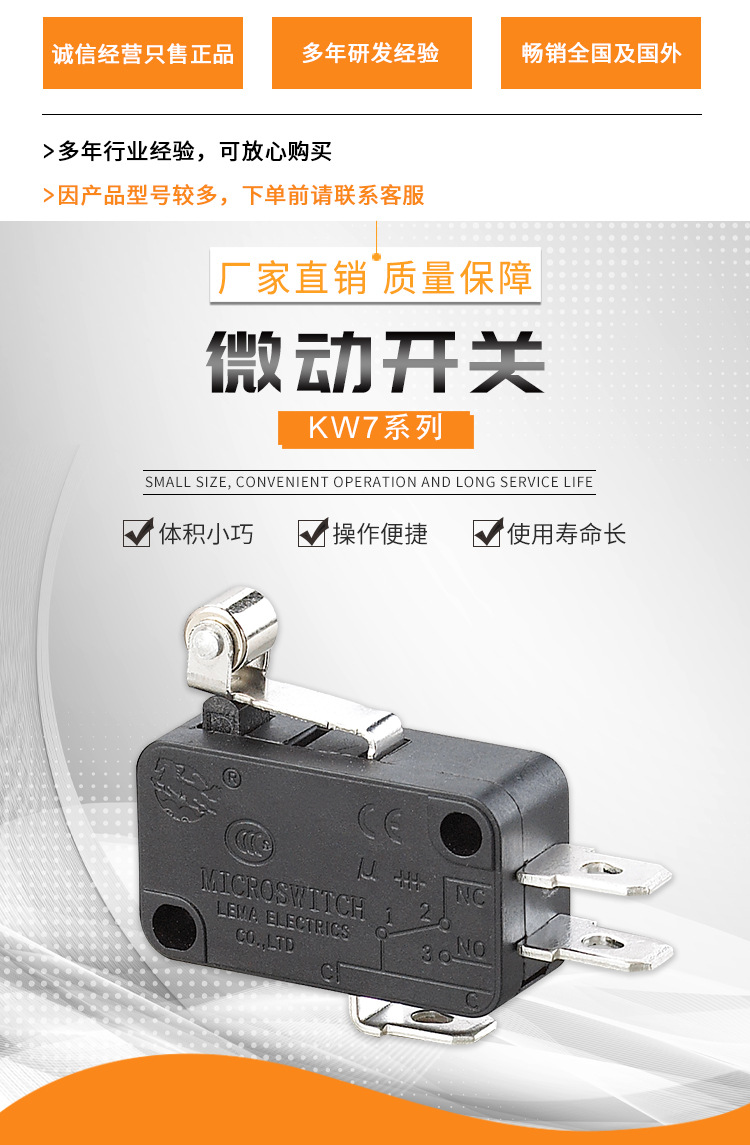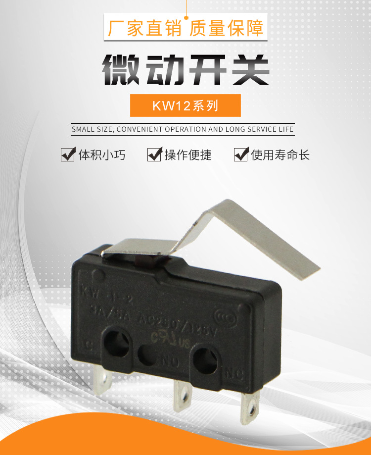 微動(dòng)開關(guān)kw12系列產(chǎn)品特點(diǎn)2021-06-04微動(dòng)開關(guān)有好幾個(gè)系列,今天先介紹一下KW12系列的產(chǎn)品緊湊型設(shè)計(jì),體積較小,適合狹小空間動(dòng)作快速,靈敏,微小間距,使用壽命長(zhǎng),可靠性高多種杠桿和接線端子可供選擇品質(zhì)值得信賴,已取得CCC,CE,UL,VDE認(rèn)證